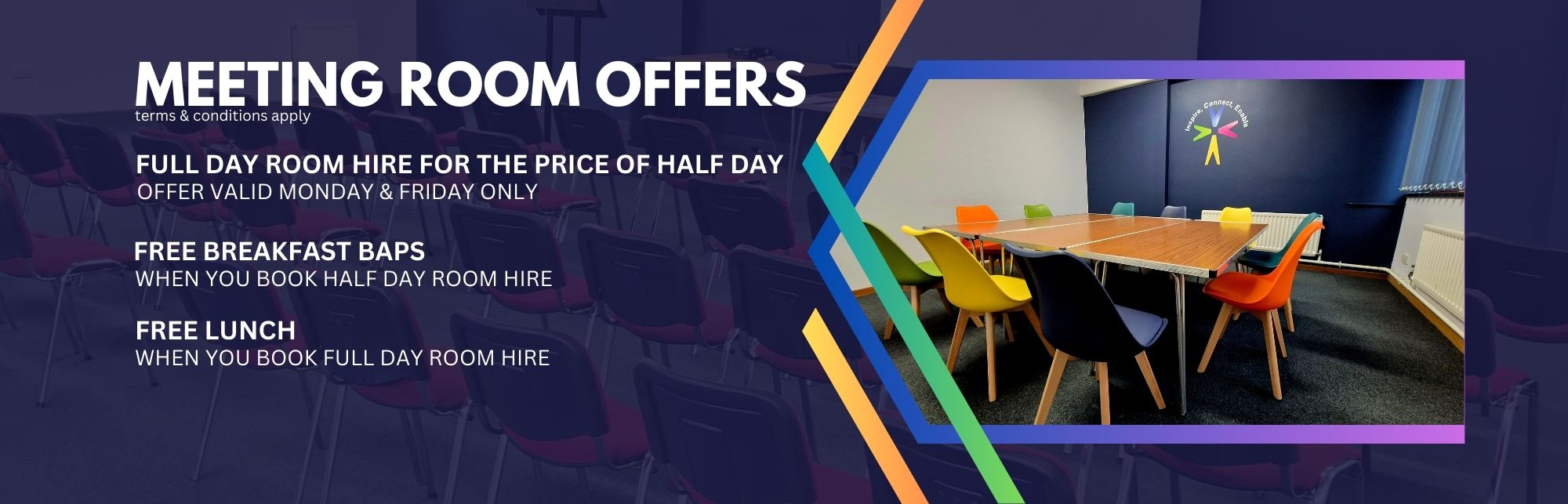 Our meeting rooms can accommodate from 2 - 100 people, subject to to set-up, and can be used for a